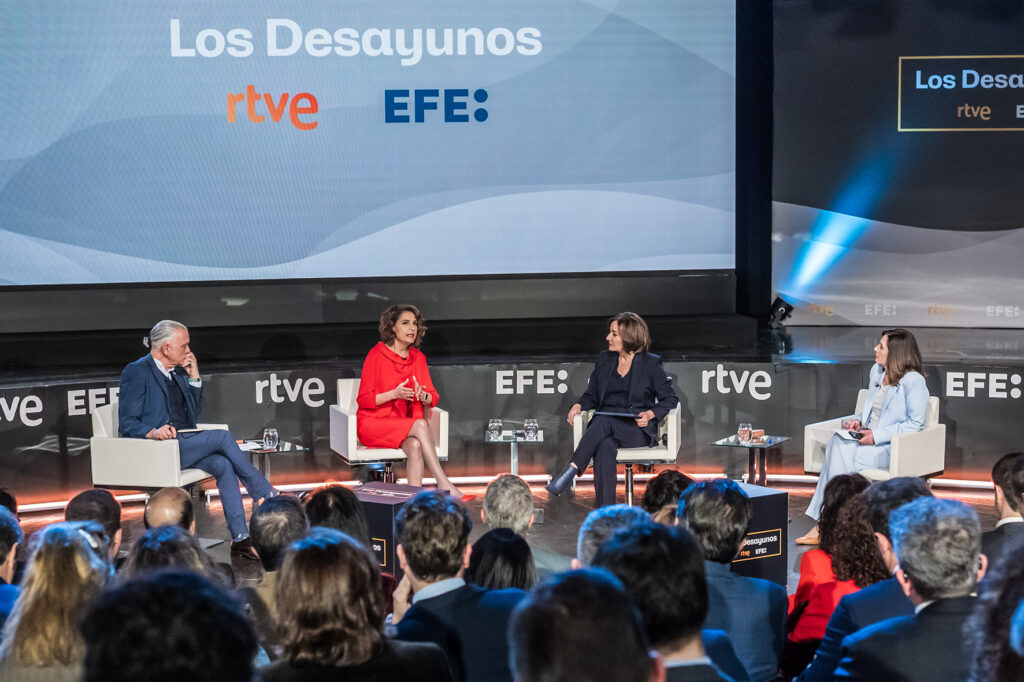 Pepa Bueno, directora y presentadora del Telediario 2; Juan Ramón Lucas, director y presentador de Las mañanas de RNE y Mamen Jiménez, directora de Economía de la Agencia EFE, han sido los encargados de entrevistar a la vicepresidenta primera del Gobierno y ministra de Hacienda en este primer desayuno informativo.
